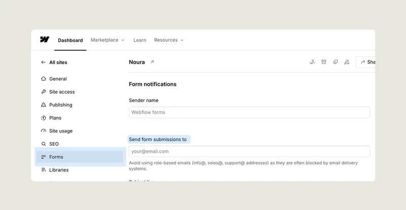 To change the favicon, email for getting form submissions, and other global settings, go to Site Settings from your Webflow dashboard or inside the project screen. There you can also manage custom domains, SEO settings, and backups. These settings apply to the entire project, not just individual pages.